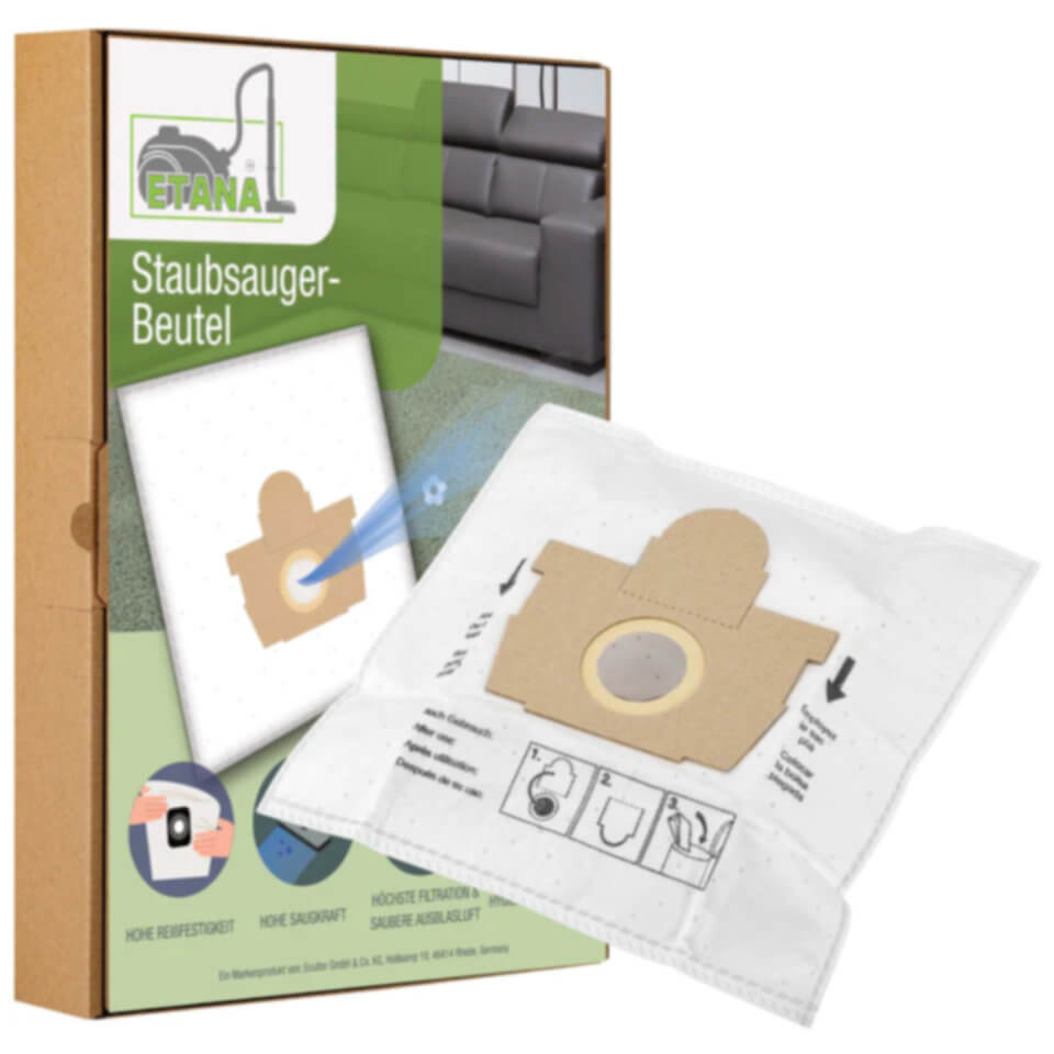 Etana vacuum cleaner bags are made in Germany. All items are in our warehouse in Rhede, Westphalia, and are shipped every working day in environmentally friendly cardboard packaging.